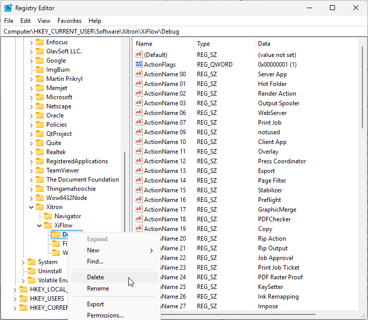 HKEY_CURRENT_USER\SOFTWARE\Xitron\XiFlow\DebugRight-click Debug → Delete → confirm.